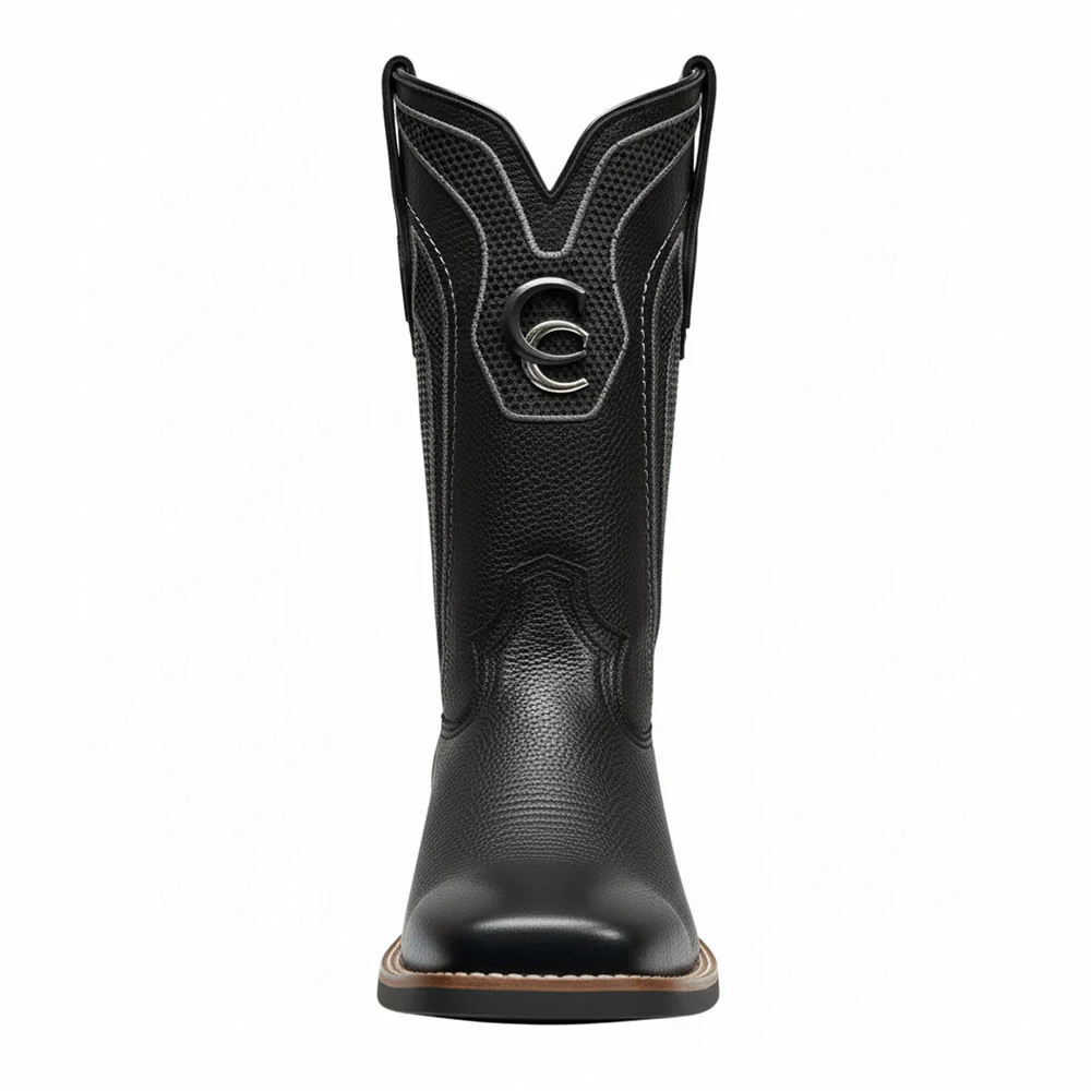 Men’s western boots crafted from genuine Italian deer leather, known for its exceptional softness, flexibility, and luxurious feel. The sleek black finish with natural grain texture highlights the premium quality of the leather, while the classic western stitching on the shaft adds a refined and authentic look.