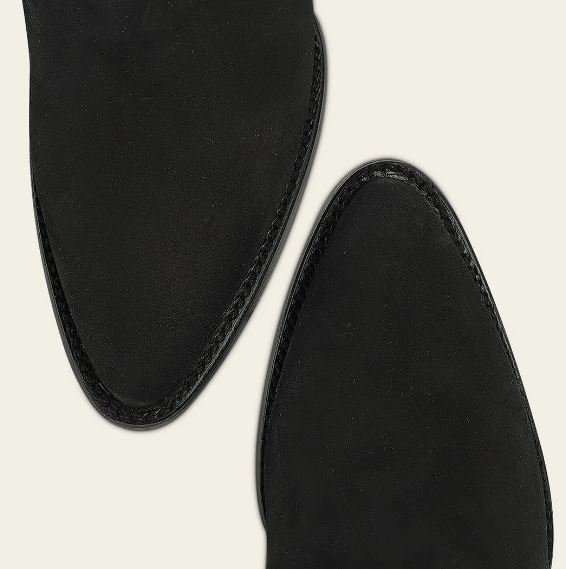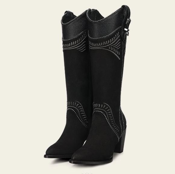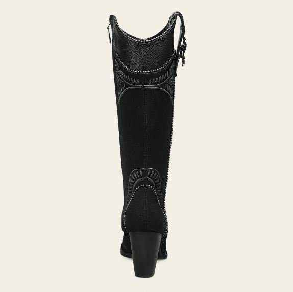 Women’s western boot crafted from 100% genuine leather with a black nubuck (suede-like) finish, offering a soft, velvety texture and a refined, elegant appearance.
