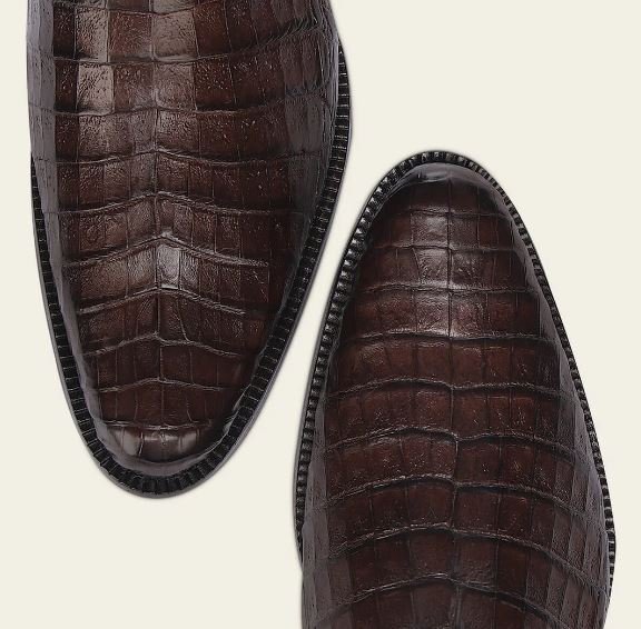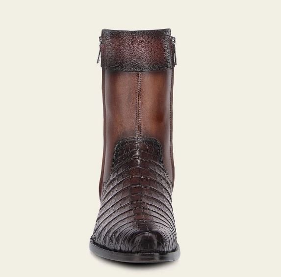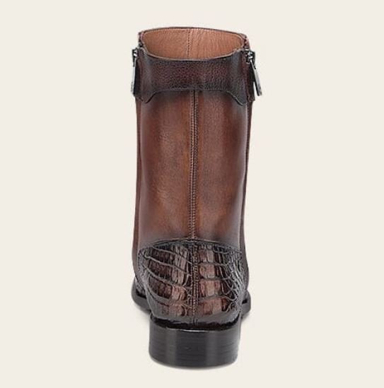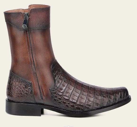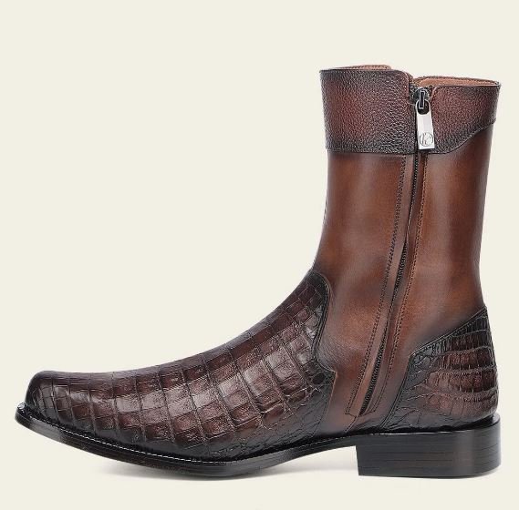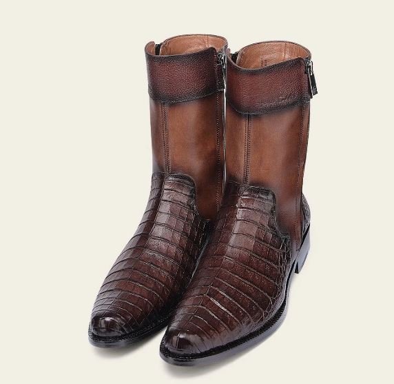 Make a bold and sophisticated statement with this exclusive Franco Cuadra men’s boot, crafted from genuine alligator leather and premium bovine leather. This model stands out for its distinctive bronze-tone alligator finish, a rare and elegant detail that may appear darker in studio photos but reveals its rich bronze character in natural light.