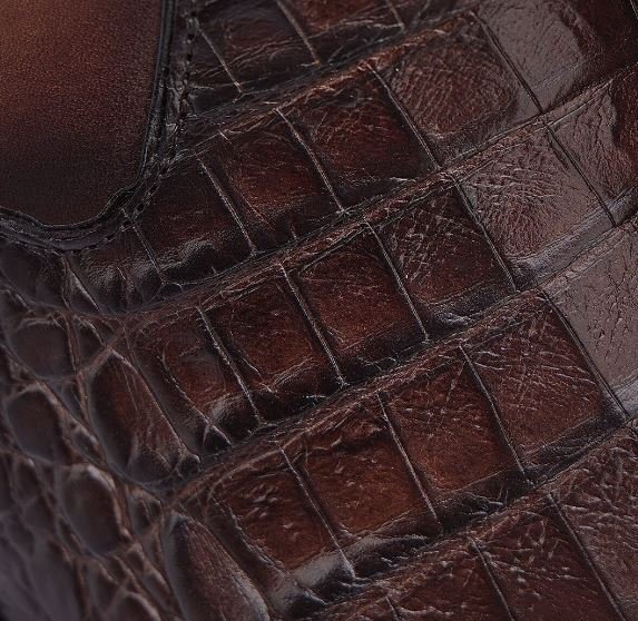 Genuine alligator leather toe and heel in a unique bronze finish