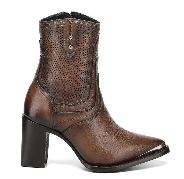 Step into refined western elegance with this highly decorated mid-calf boot crafted from genuine bovine leather in a rich brown tone. Designed for women who appreciate luxury craftsmanship and statement footwear, this model combines sophisticated structure with intricate artisanal detailing.