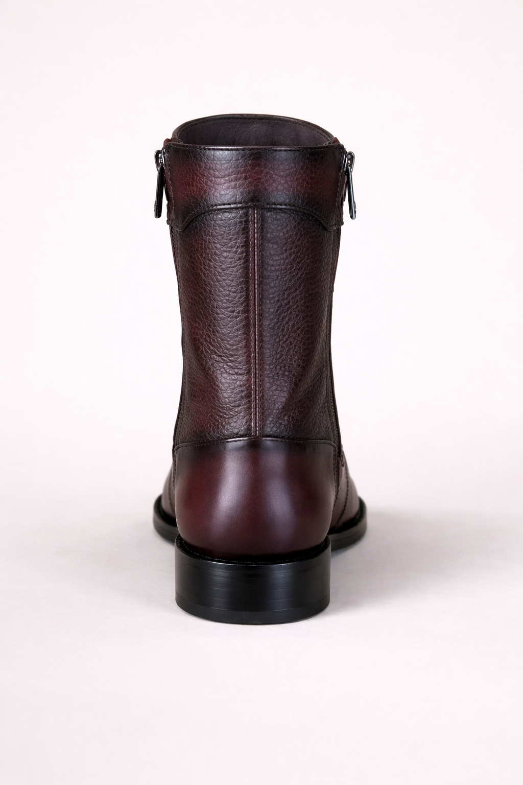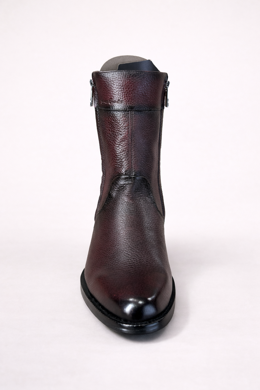 The cherry tone features subtle depth and natural tonal variations that may appear darker or lighter depending on lighting, giving the boot a luxurious and exclusive appearance compared to standard catalog images.
