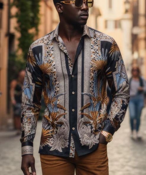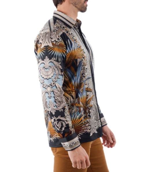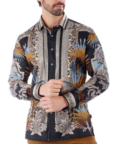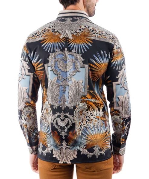 The Barabas-designed Rage Look shirt features a stunning hand-placed rhinestone Baroque pattern, bringing a touch of opulence. Its lightweight fabric offers a slim fit and long sleeves, accentuated by a distinctive floral and leopard print design. This one-of-a-kind piece exudes luxury and style.