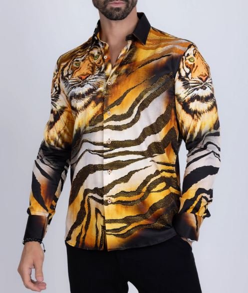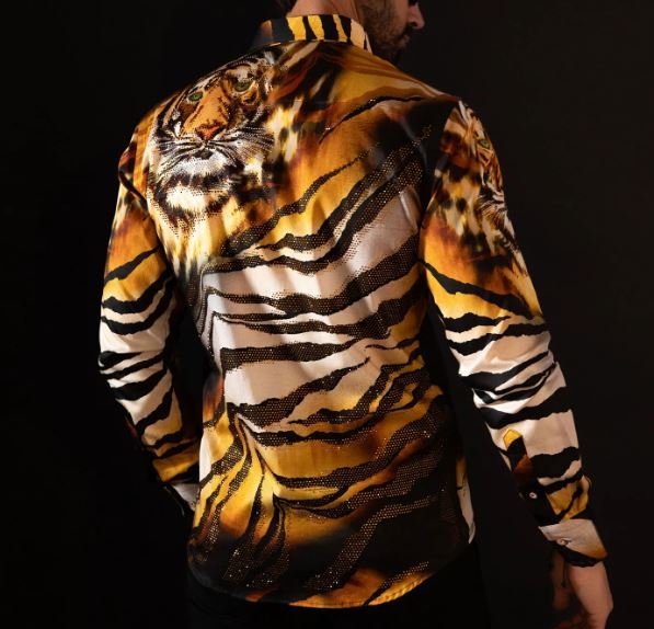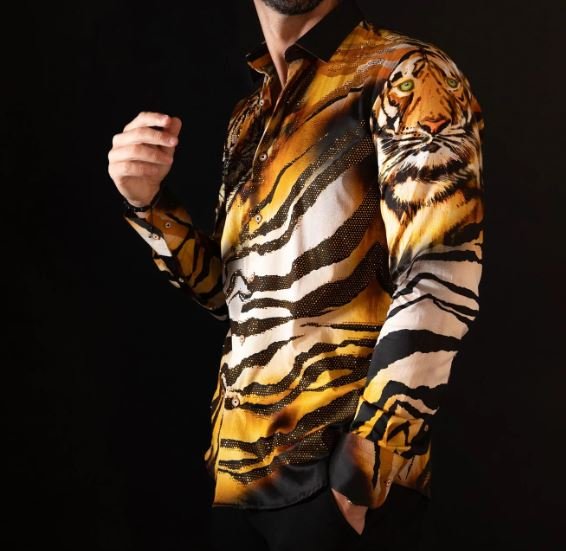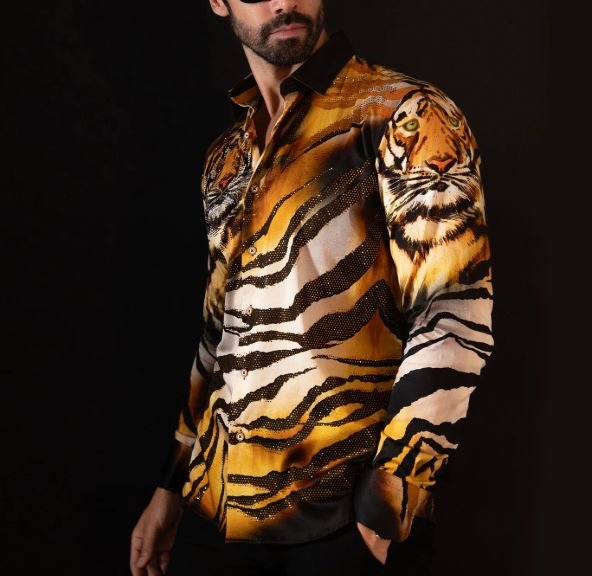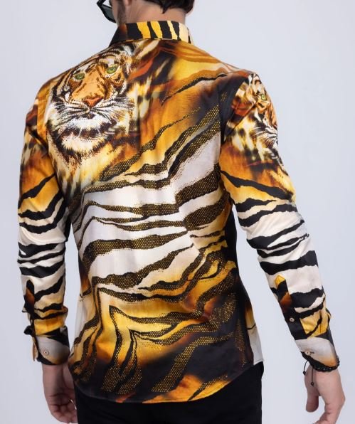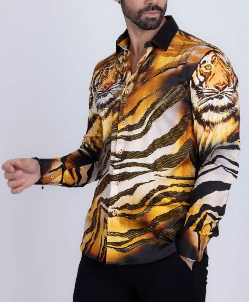 This men’s button-down shirt showcases a tiger print animal motif on lightweight fabric, creating a striking jungle-inspired look. It features unique collars and a slim fit silhouette with long sleeves and a button-up front. An original creation from Barabas, it combines sophisticated style with meticulous craftsmanship.